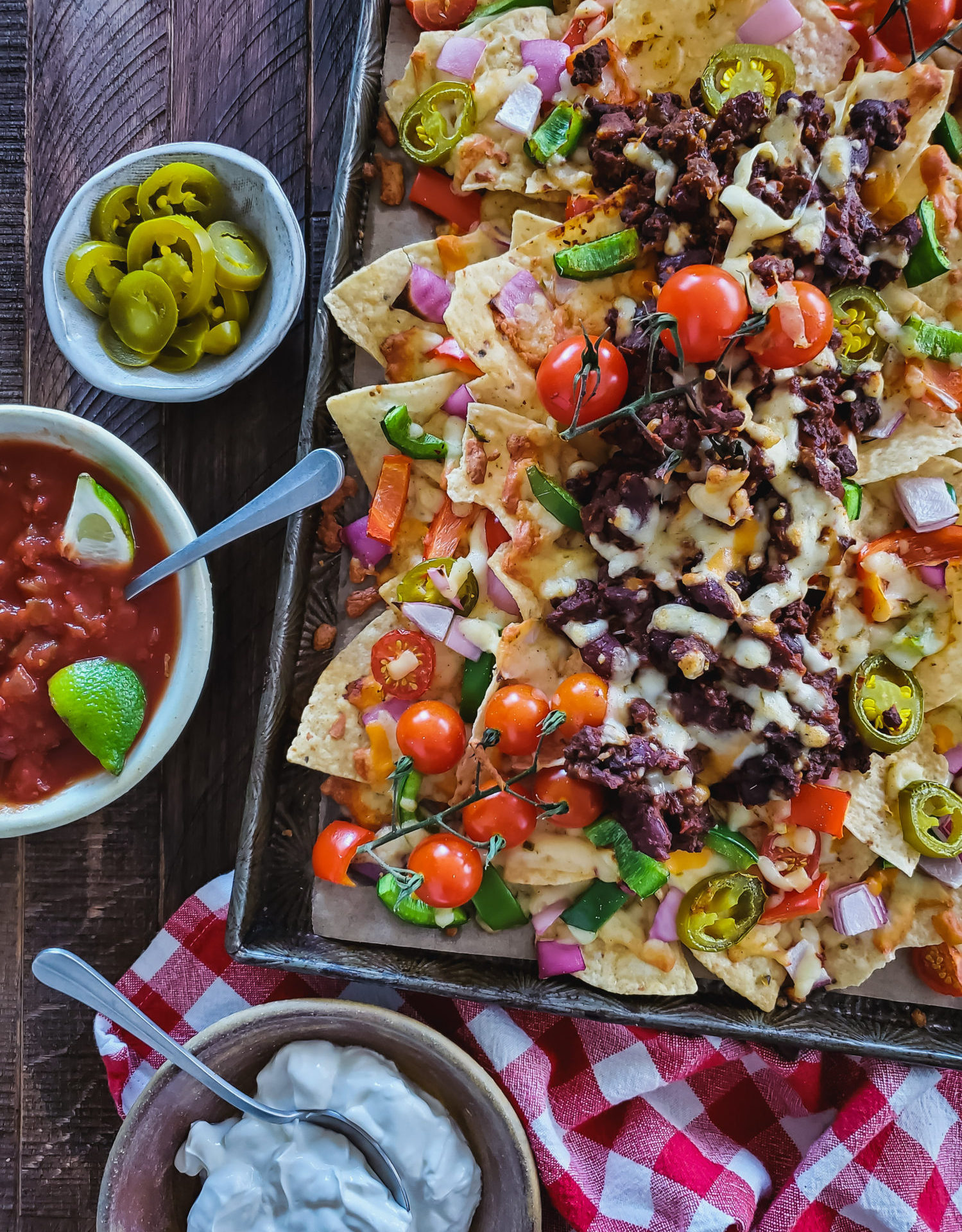 When it comes to veggies for nachos, the sky is the limit.  We like red and green peppers, cherry tomatoes, white, red or Spanish onions, olives, jalapeños, and then avocado slices once they come out of the oven.  What veggies do you like?   Bowls of salsa, guac, and sour cream, and life is good.  Just add Cervezas!