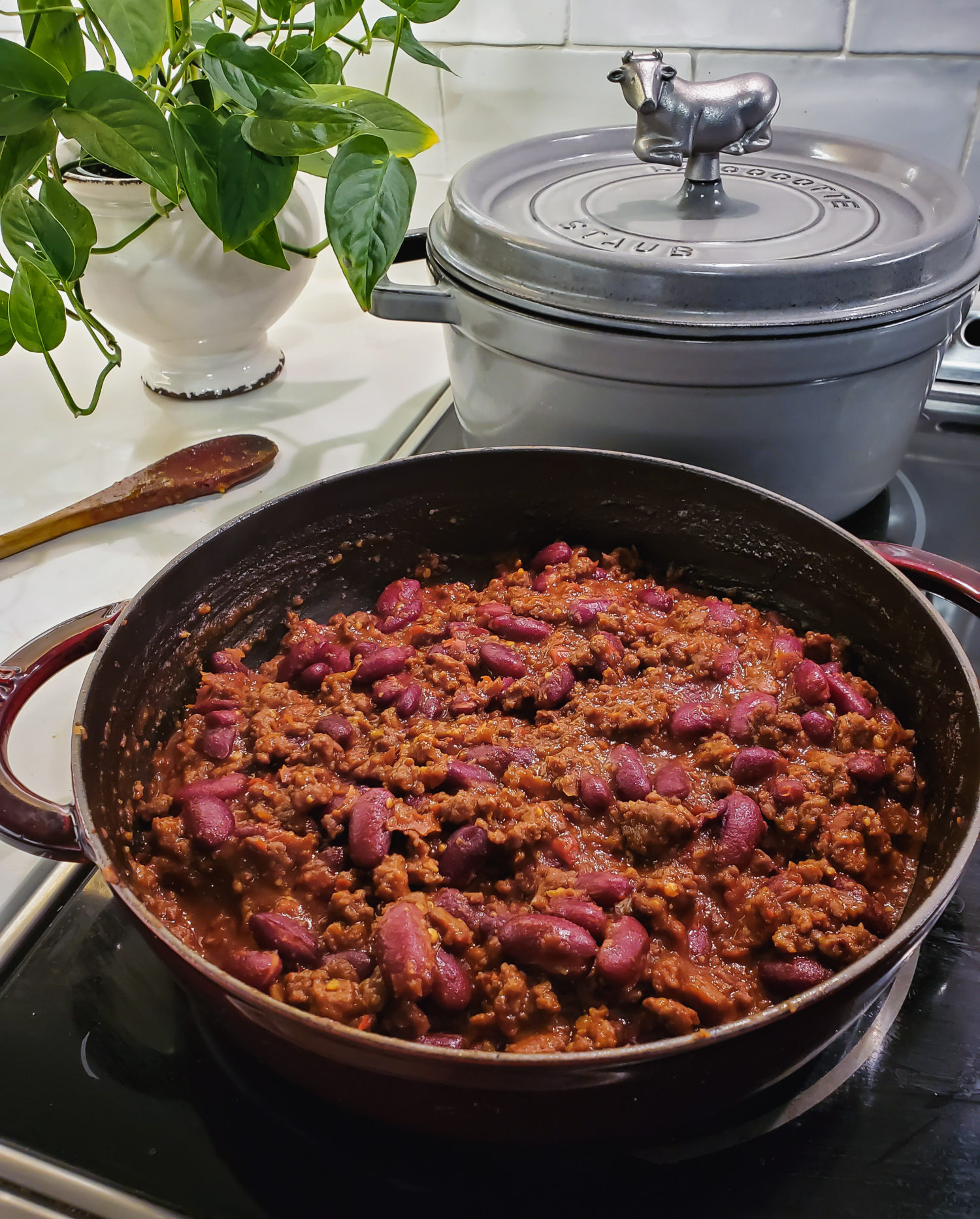 The chilli is a meat and bean chilli, with beef stock instead of tomato purée making up the majority of the simmering liquid.  The spices are all there, but you want to let it cook down so that much of the liquid has cooked off.  If you end up using this chilli for another meal, feel free to add in more liquid or some more of those crushed tomatoes, to make it dinner a second time around, with a side of Mexican rice etc.