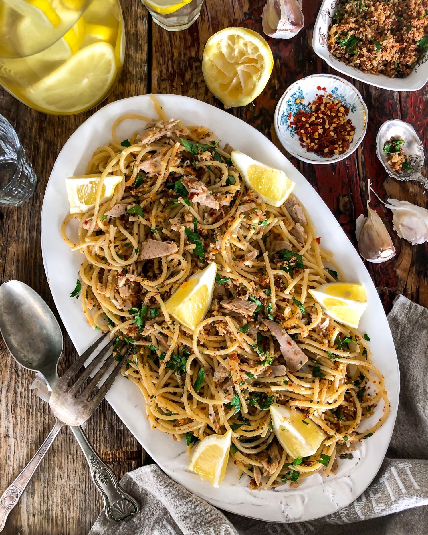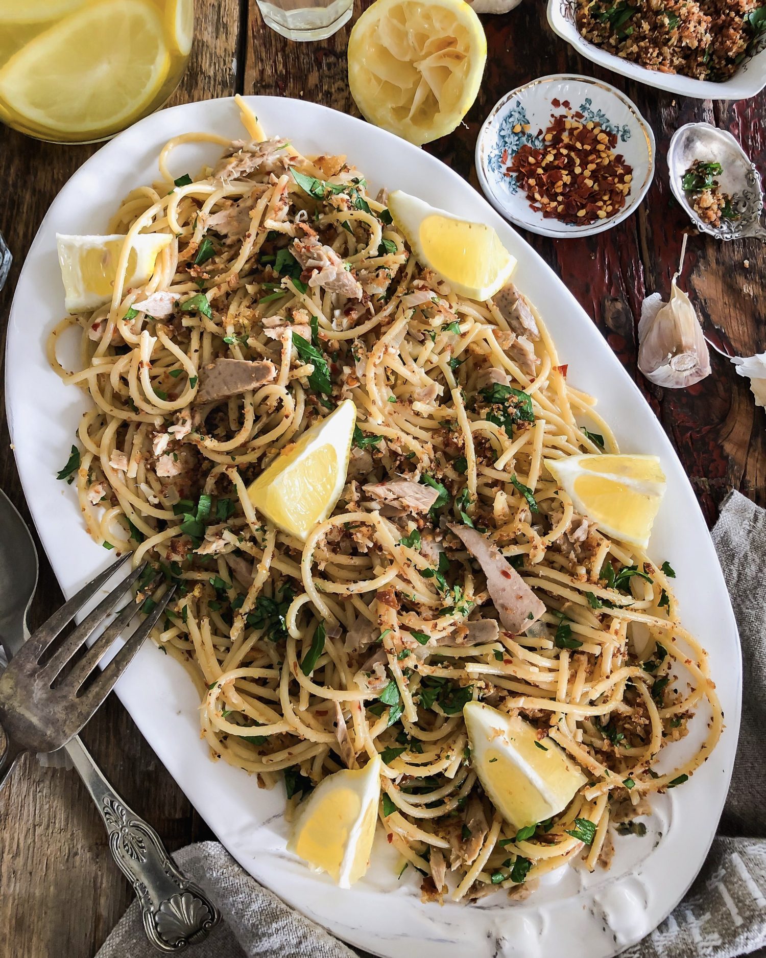 A simple weekday pasta dish that doesn’t sacrifice flavour. A toasted breadcrumb mixture is flavoured with lemon zest and parsley and becomes the crunch to the flaked tuna, onion, garlic and lemon ‘sauce’. Chilli flakes for oomph. Comes together in a breeze!