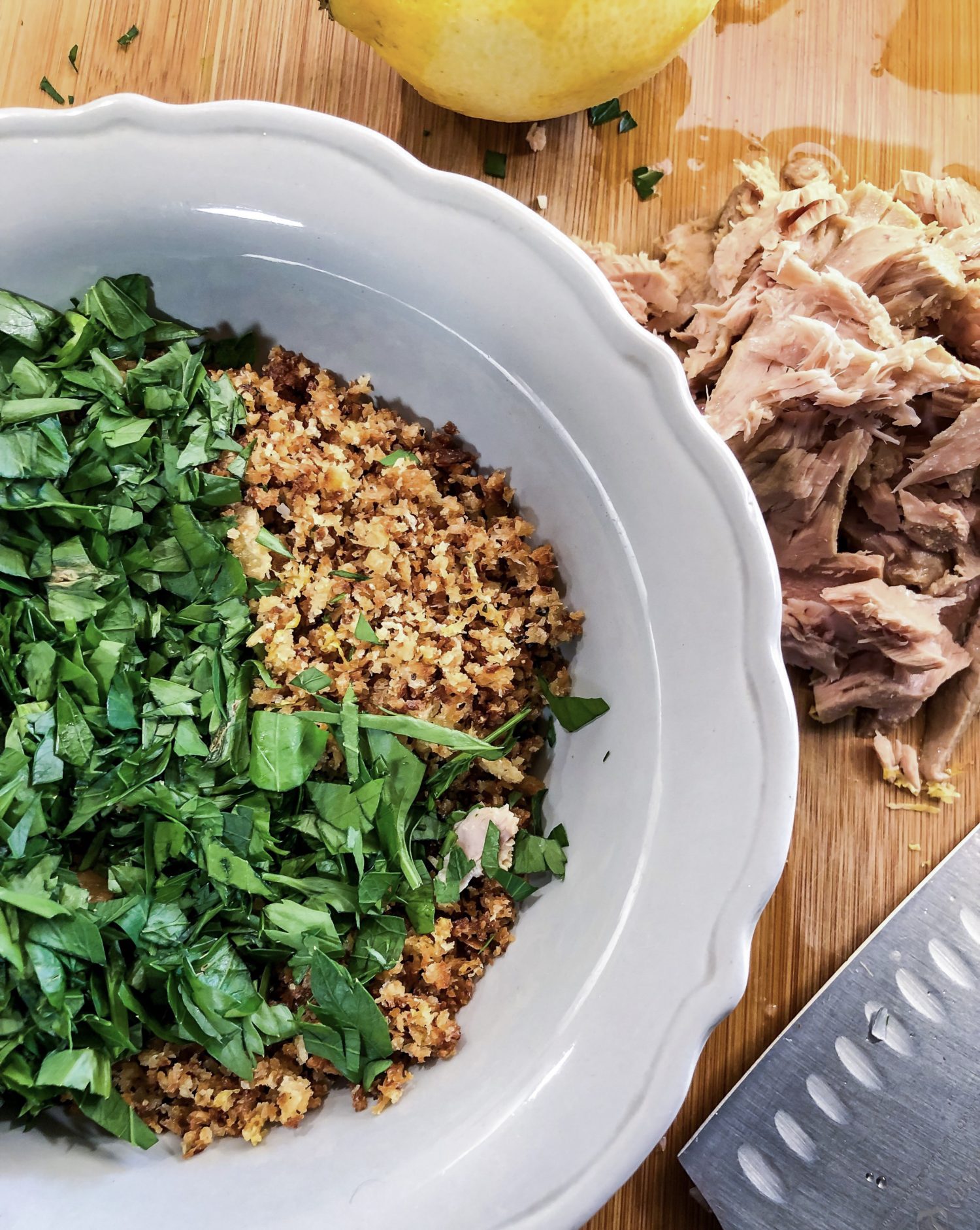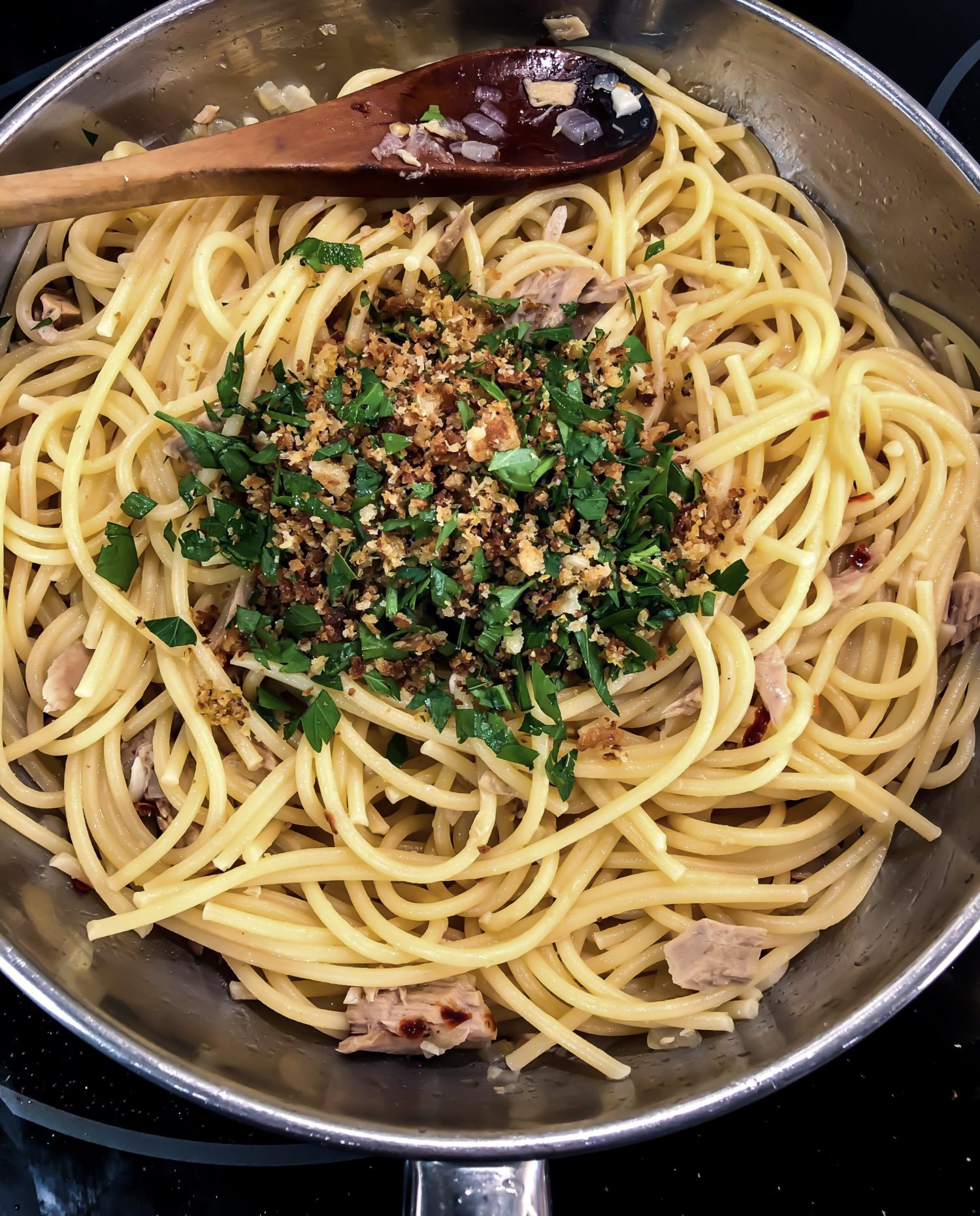 The drained pasta gets added to the tuna sauce in the skillet, along with some of the pangrattato. Stir it all. Add some pasta water to help it become a bit more smooth. Serve with the remaining pangrattato and lemon on the side.