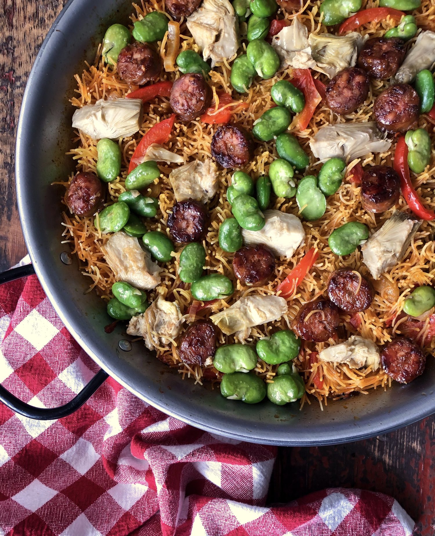 If you want to add meat: sauté some fresh chorizo, sliced into bite sized pieces. Or why not skewer some shrimp or chicken and grill along the fideua if you are cooking this outside on your grill. Add them towards the end with the fava beans. If you want to use peas instead of fava beans, that’s great as well.