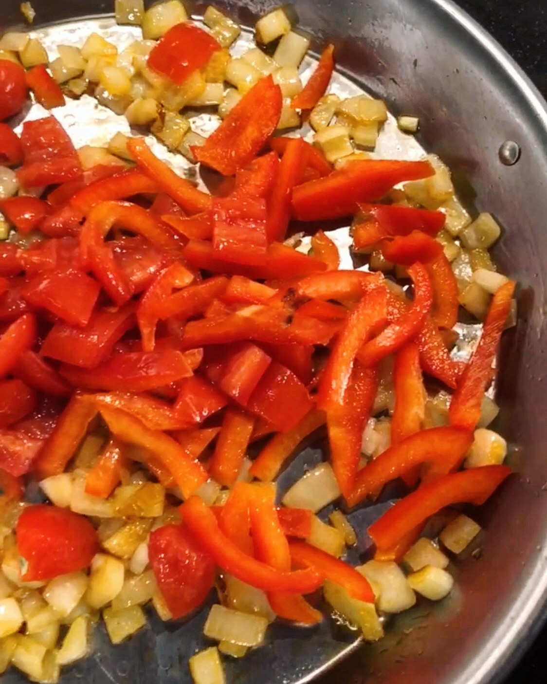 - Add the bell peppers and tomatoes and cook, stirring until soft and thickening. Reduce the heat if anything is starting to scorch on the bottom of the pan.