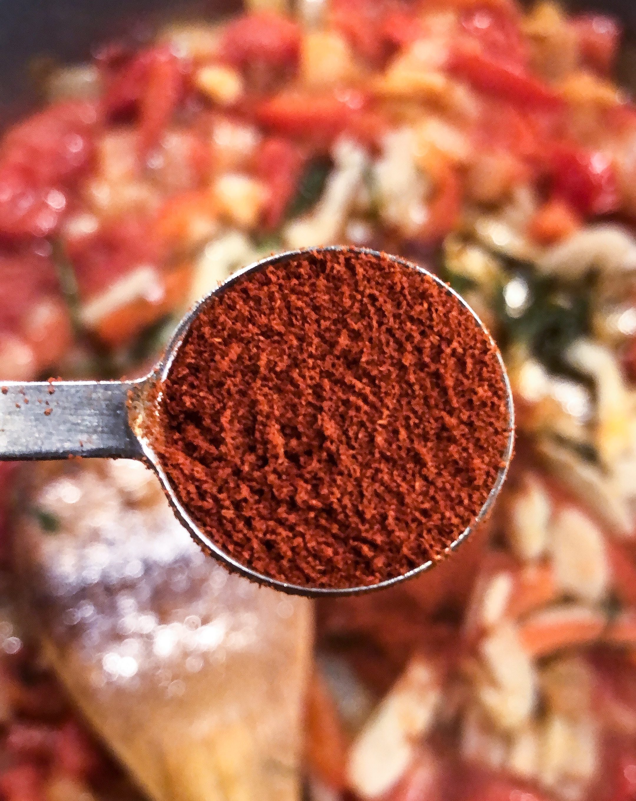 Add the paprika, chili flakes or cayenne, and stir. Cook for 2 minutes.