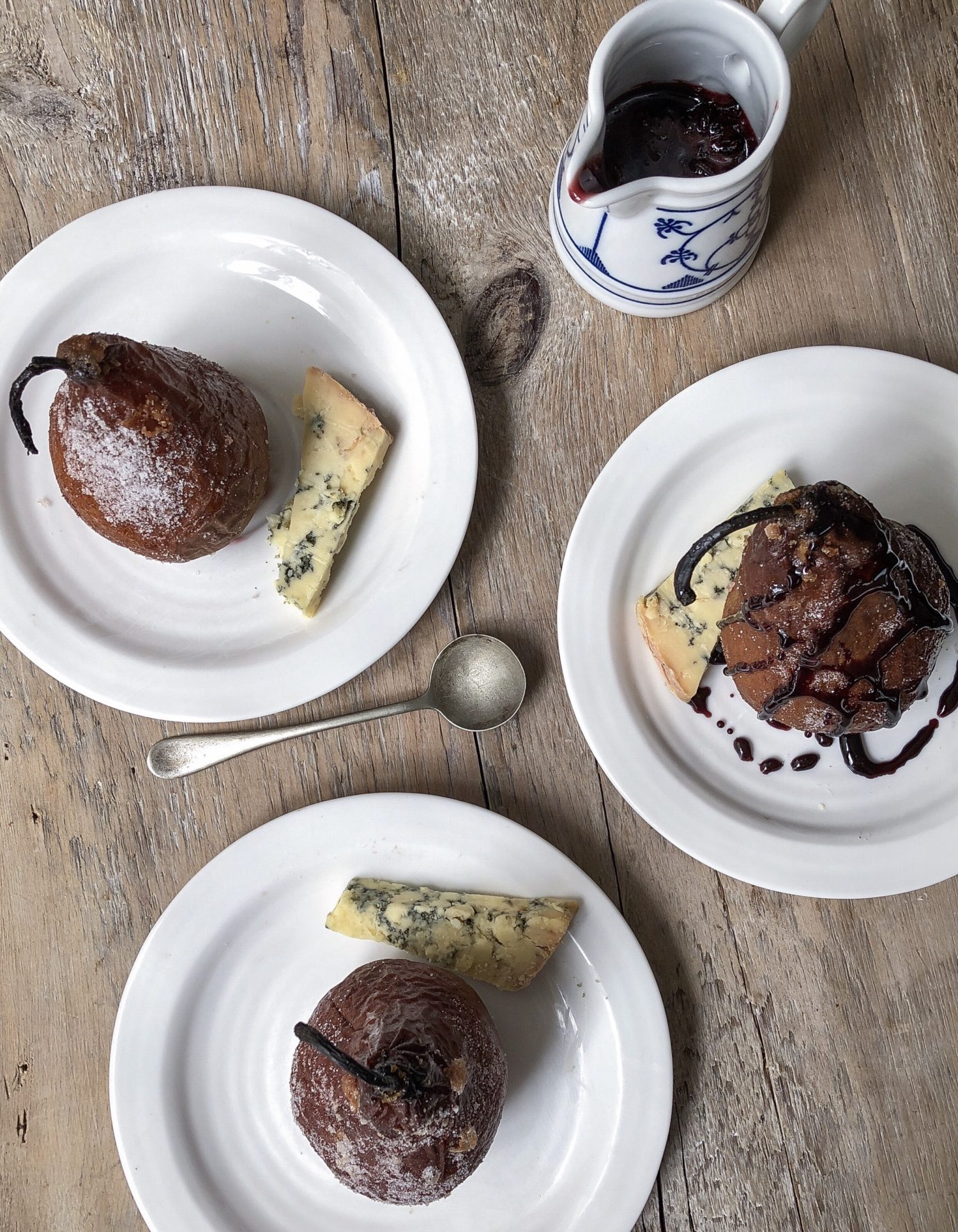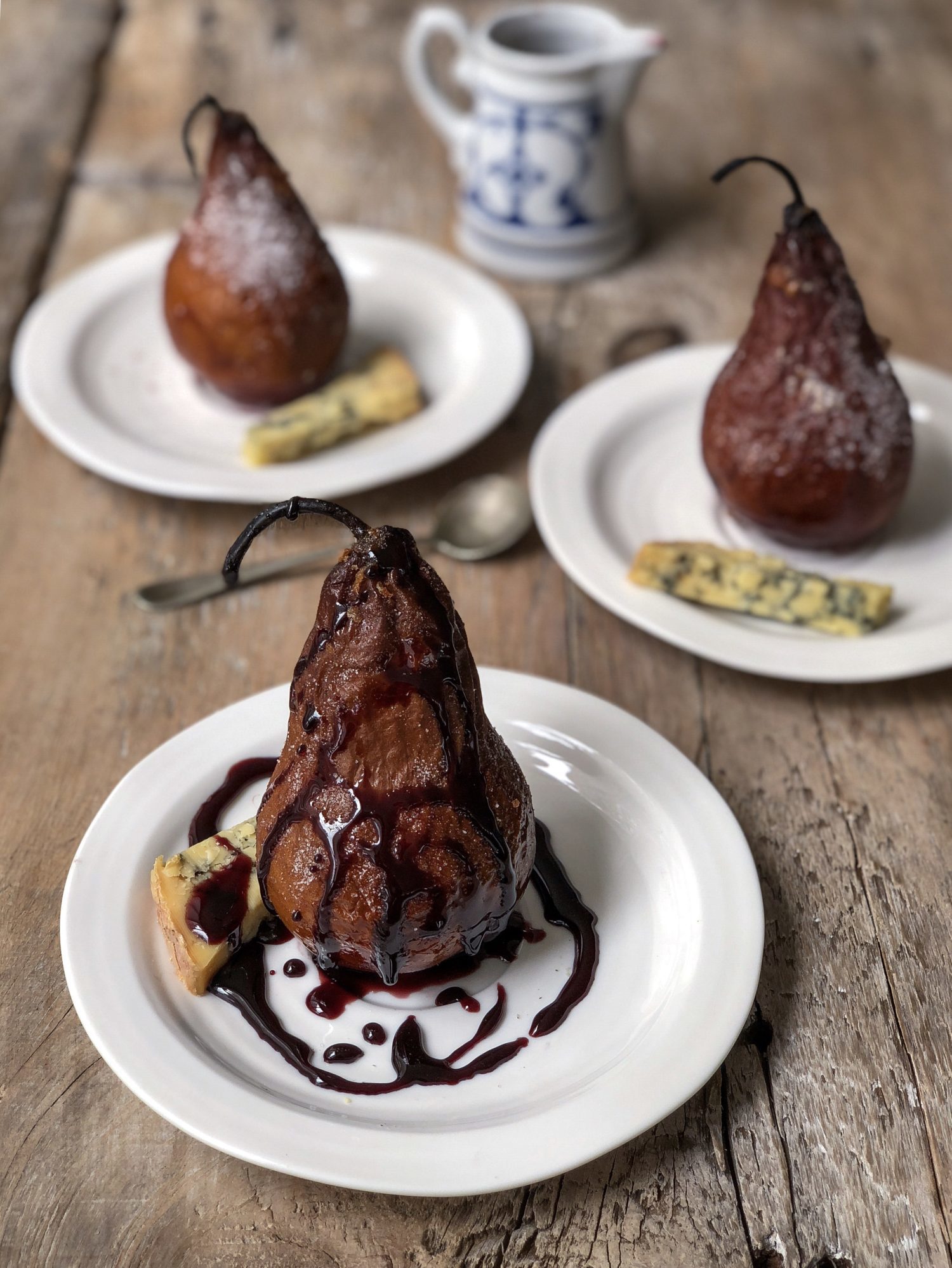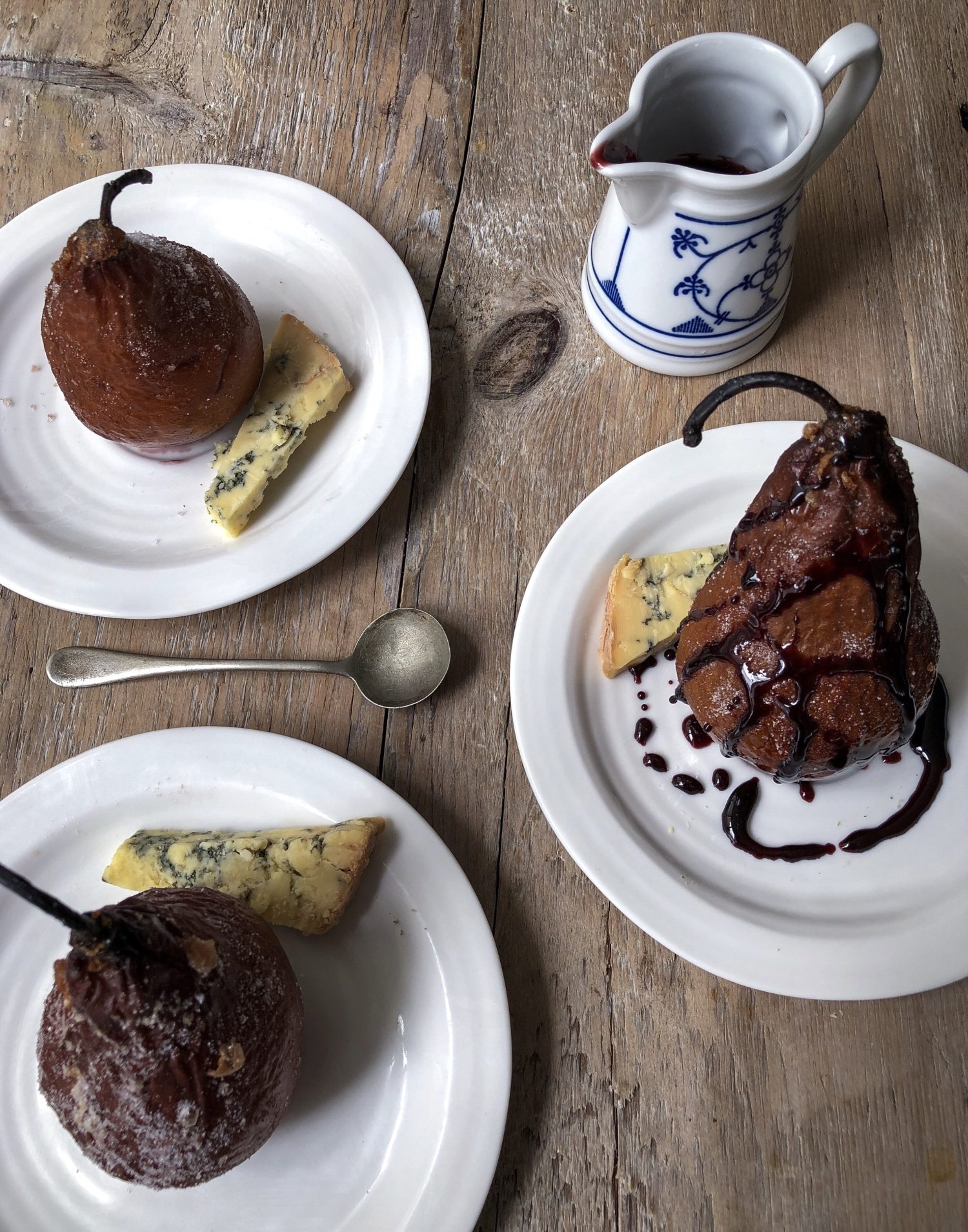 Serve a whole pear on a small plate or bowl.  Add a slice of Stilton or any other blue cheese on the side.  Or if the crowd is less savoury, you can naturally add a scoop of vanilla ice cream.  And over it all, drizzle some of your sauce/syrup.  Oh my!!  Having made this several times already, and getting such rave reviews from Jim and other guests, this will continue to be a dessert go-to all winter long!  It’s so easy.  No baking required!  The hardest part is stirring the wine reduction.  In fact, if you just want to make the wine reduction, go for it!!  It would a fantastic syrup over almost anything: chocolate ice gelato, cheesecake, sautéed plums etc, even over grilled ham and brie sandwiches!