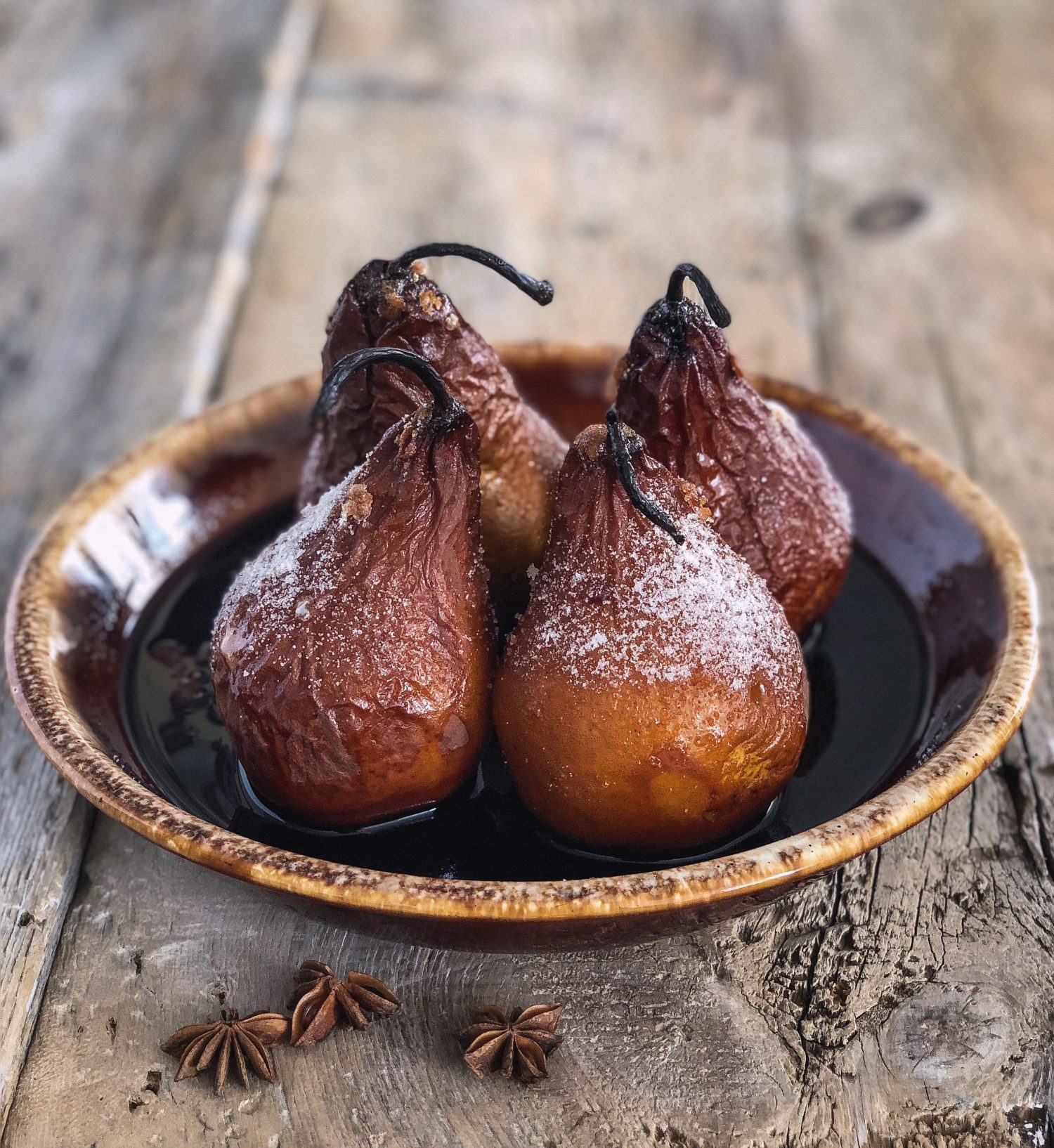 Warm spices and sugar combine with red wine to help roast these pears into a perfect winter treat.  The skin of the pears become one of the stars, and the wine is reduced into a fabulous sauce that works well with fruit, cheese, cake or even over ice cream.