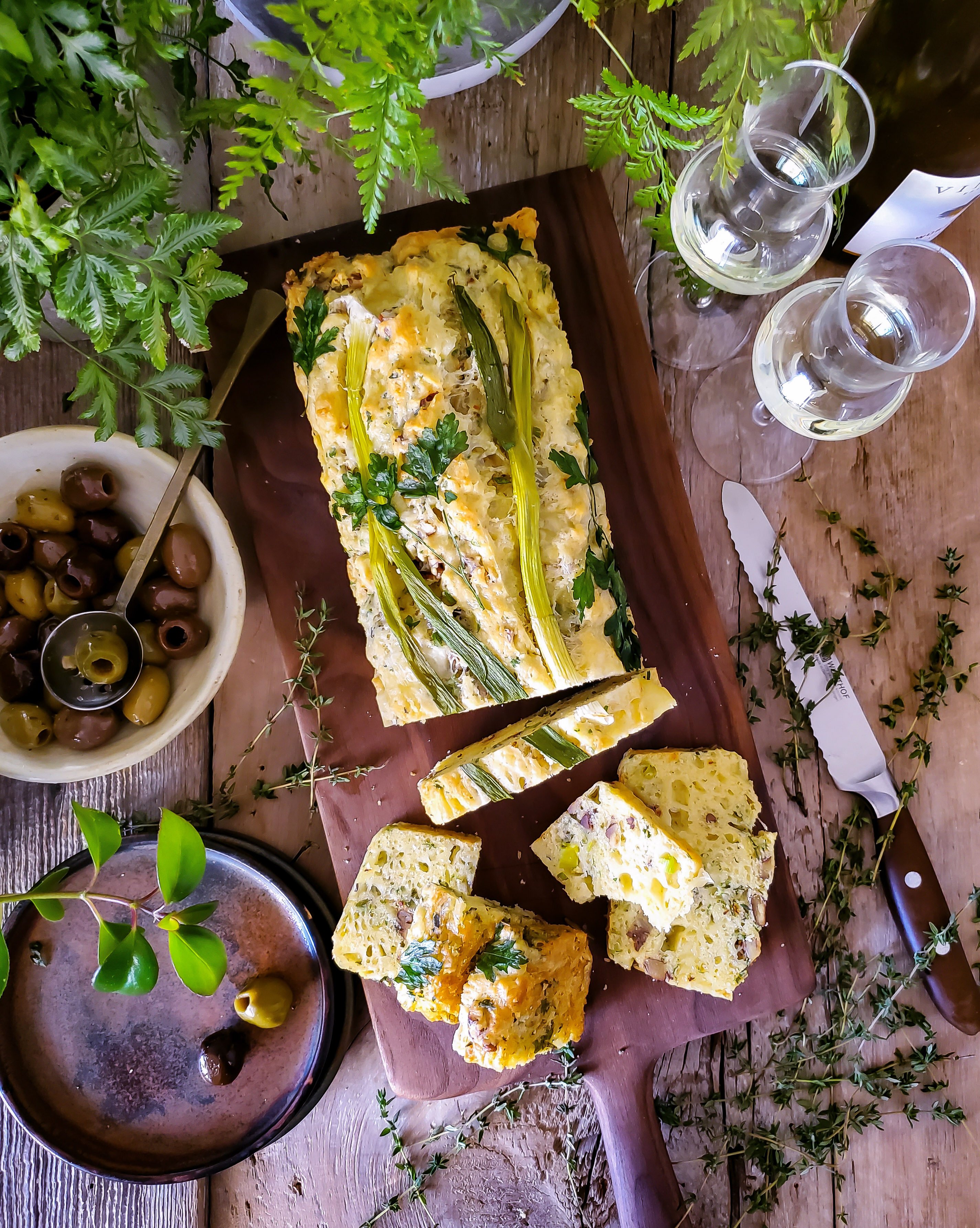 As I have said so many times, a good serrated knife is your friend for bakes like this. With the delicate top, you don’t want a dull knife to push the scallions or leaves down into the bread. A sharp knife with a sawing, back and forth motion, will mean a truly clean cut. Please get one, I promise you won’t regret the purchase.