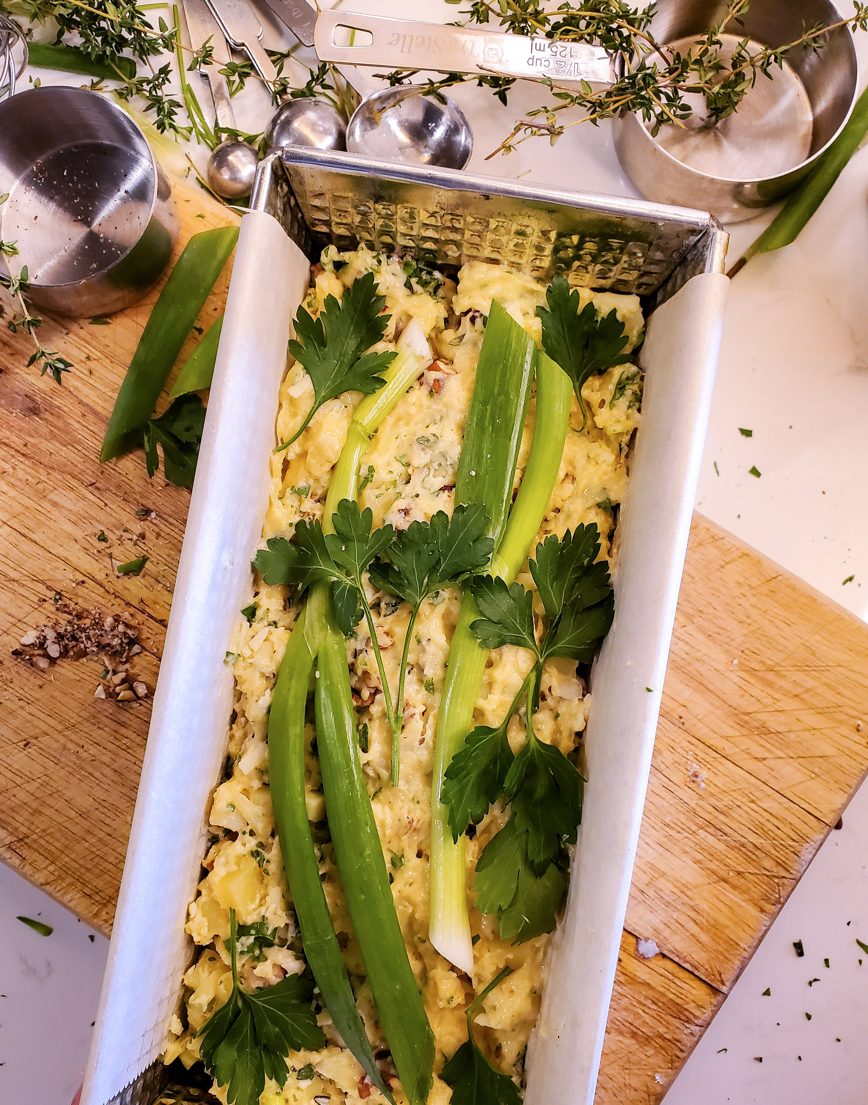 Add in the cheeses, herbs, scallions and toasted nuts. Fold till just combined. Spoon it into the prepared pan. Decorate the top with extra herbs and scallions if using.