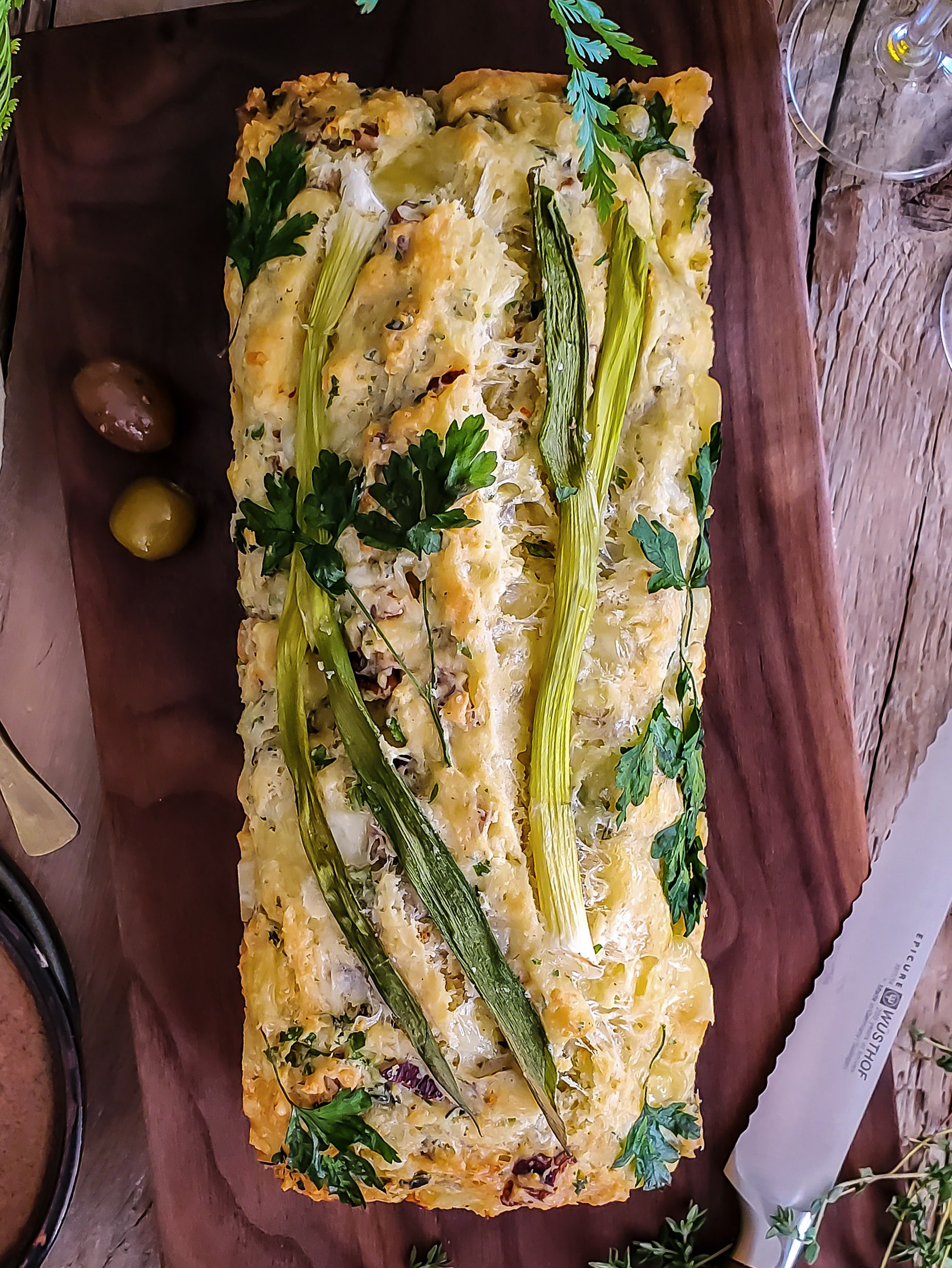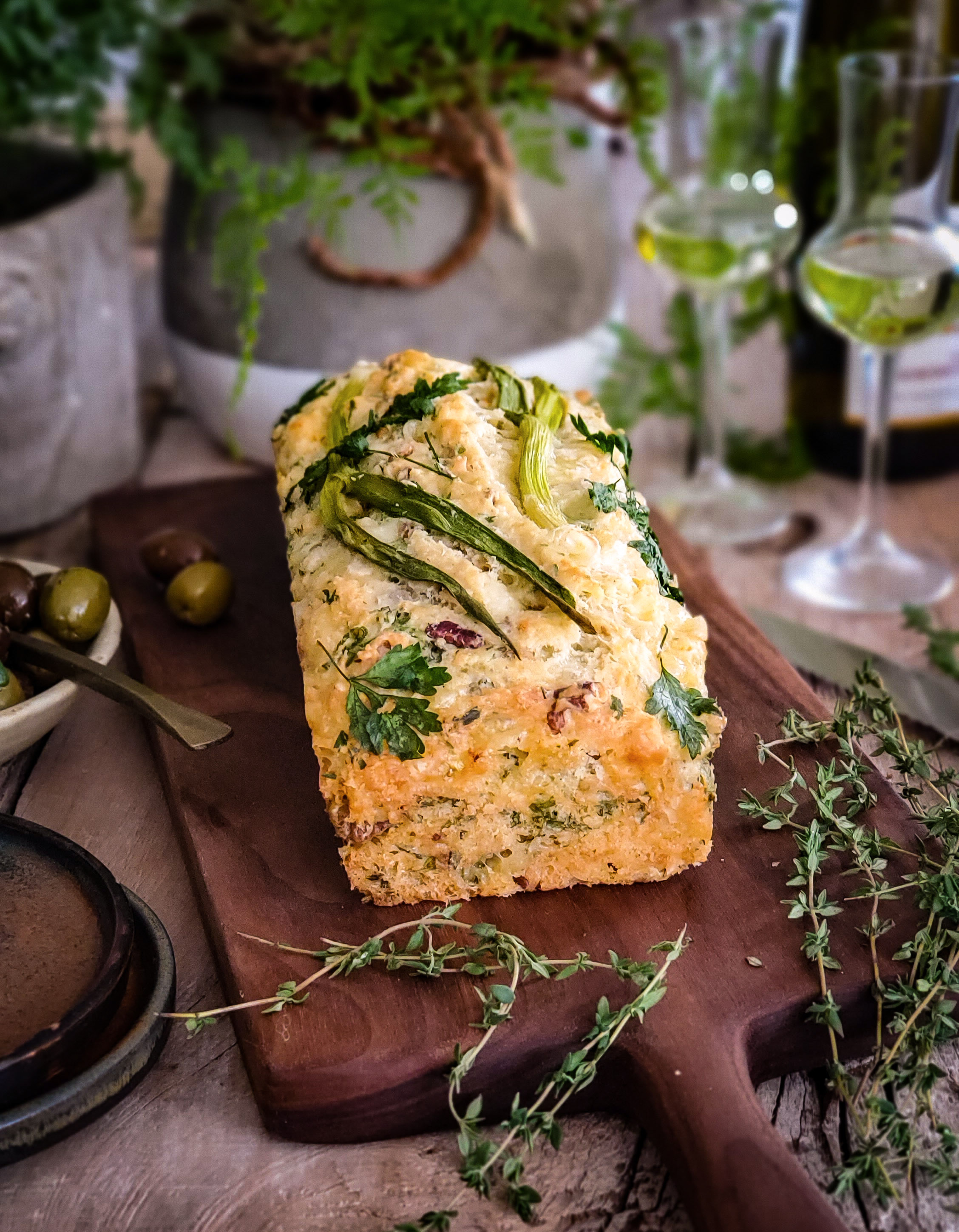 A perfect savory snacking bread for your next appetizer or cocktail party. It works well with cheeses, fruit and wine. Or toasted on the side of a bowl of soup. It's a quickbread, so it comes together in moments!