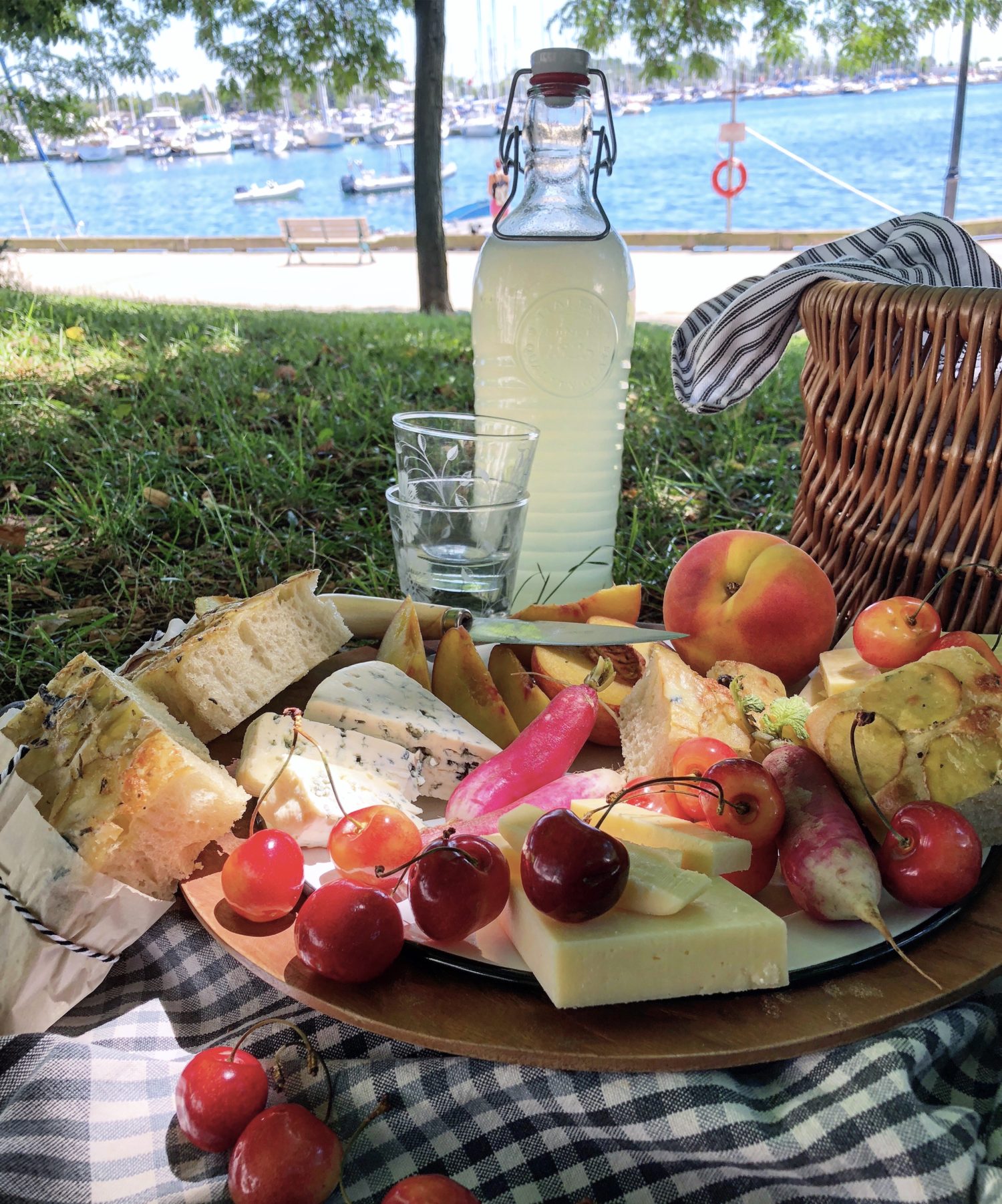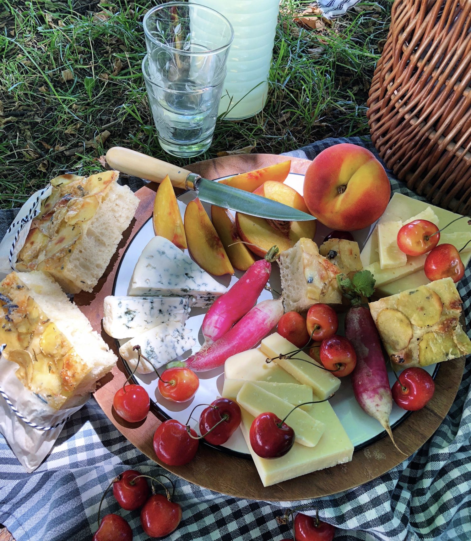 So I sliced up some focaccia and added it to the picnic basket, along with some homemade lemonade and glasses, and we were all set for our impromptu picnic by the bay. We laid out some blankets, pulled out a charger plate, and spread out our little feast. We eat with our eyes first, even if it is a rustic, simple cheese plate for two! Books, drinks and cheese, what more did we need for enjoying the most perfect summer day here in Toronto- at least, my definition of perfect!