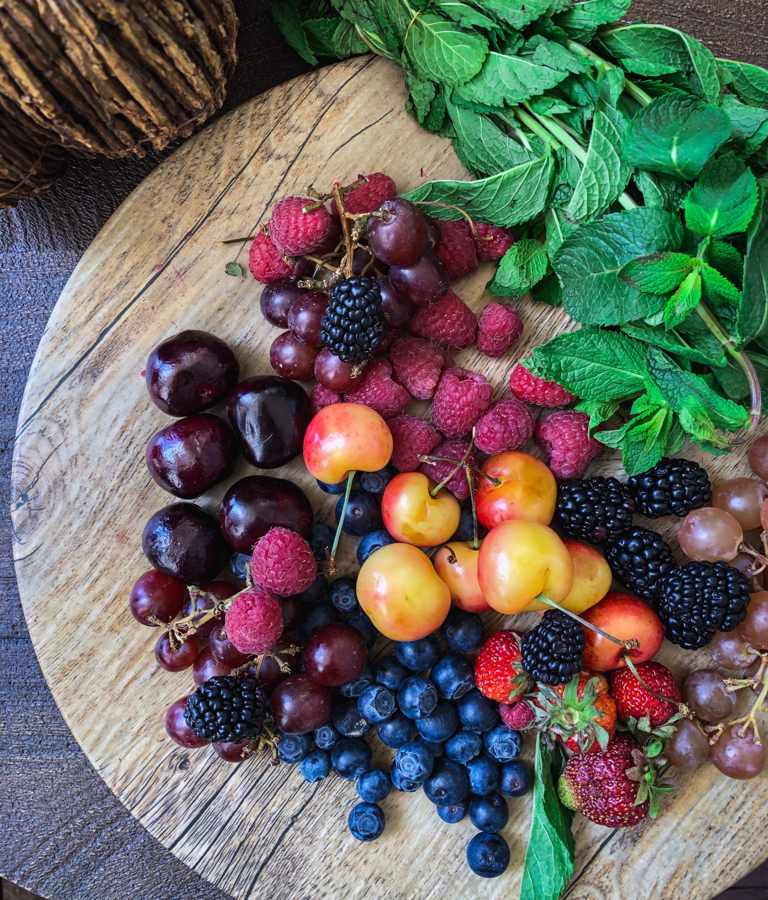 Now you are ready to decorate!! Whoo whoo! This is where you can have some fun. Find all the berries and other fruit you want to use. I used strawberries, blueberries, raspberries, blackberries, cherries, grapes and mint for this cake today. If there were currants available, they would be such a lovely addition- they drape and are so delicate. Figs or small citrus segments work great as well.
