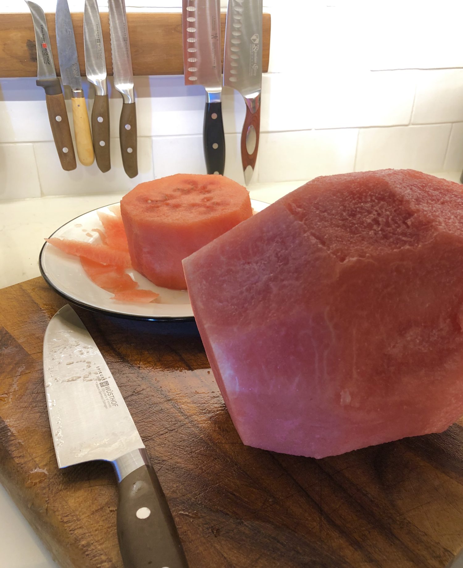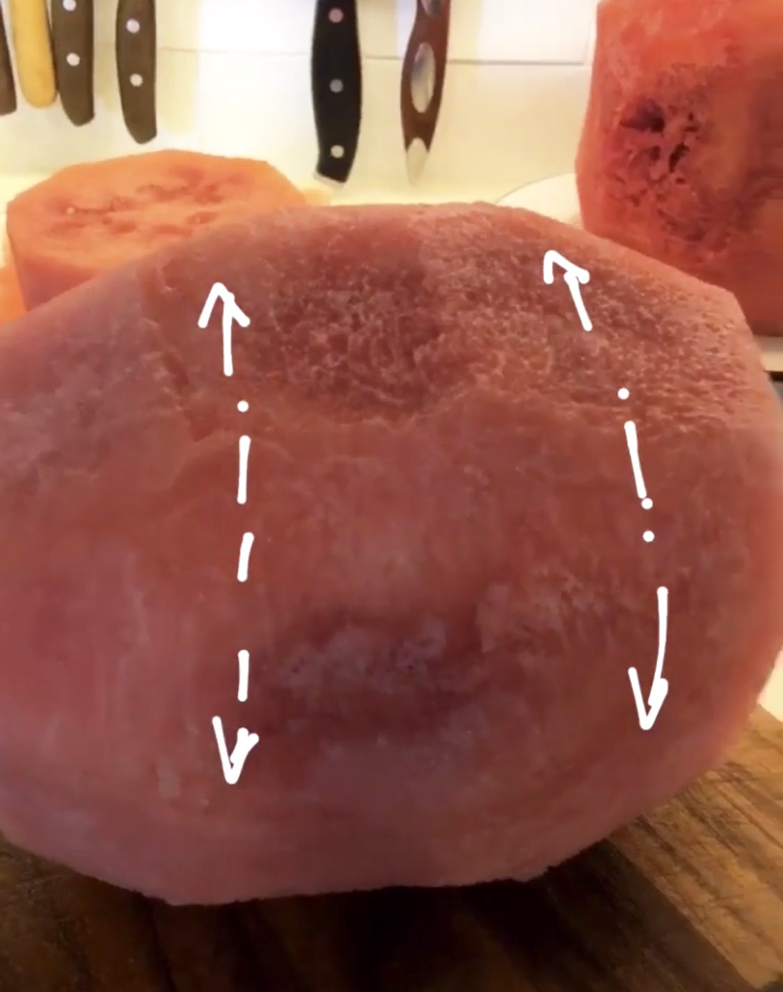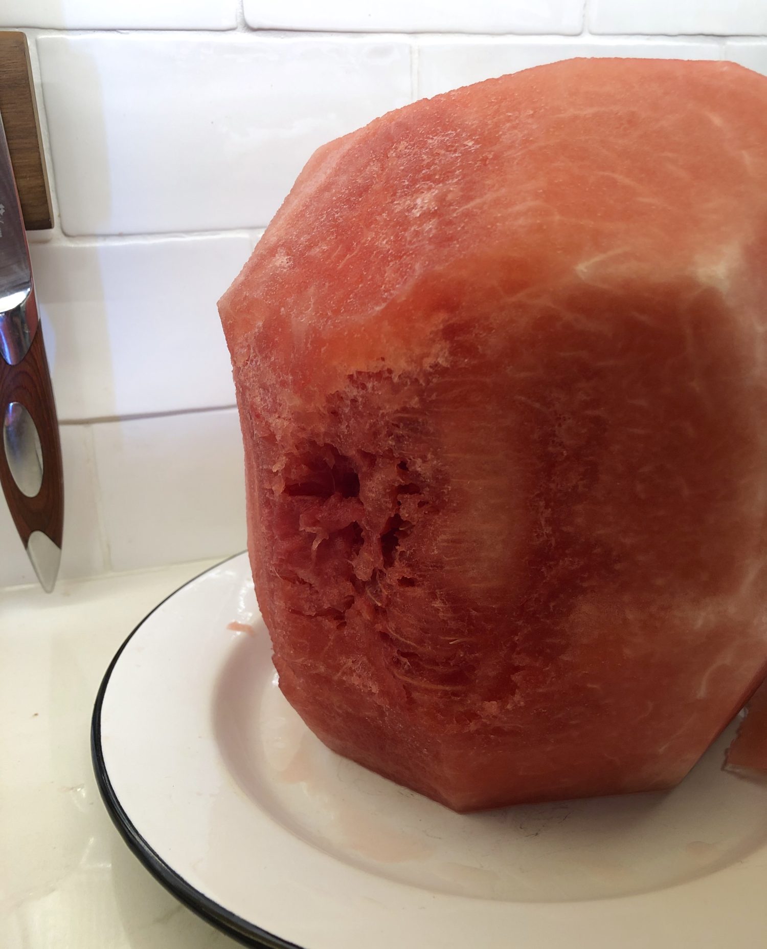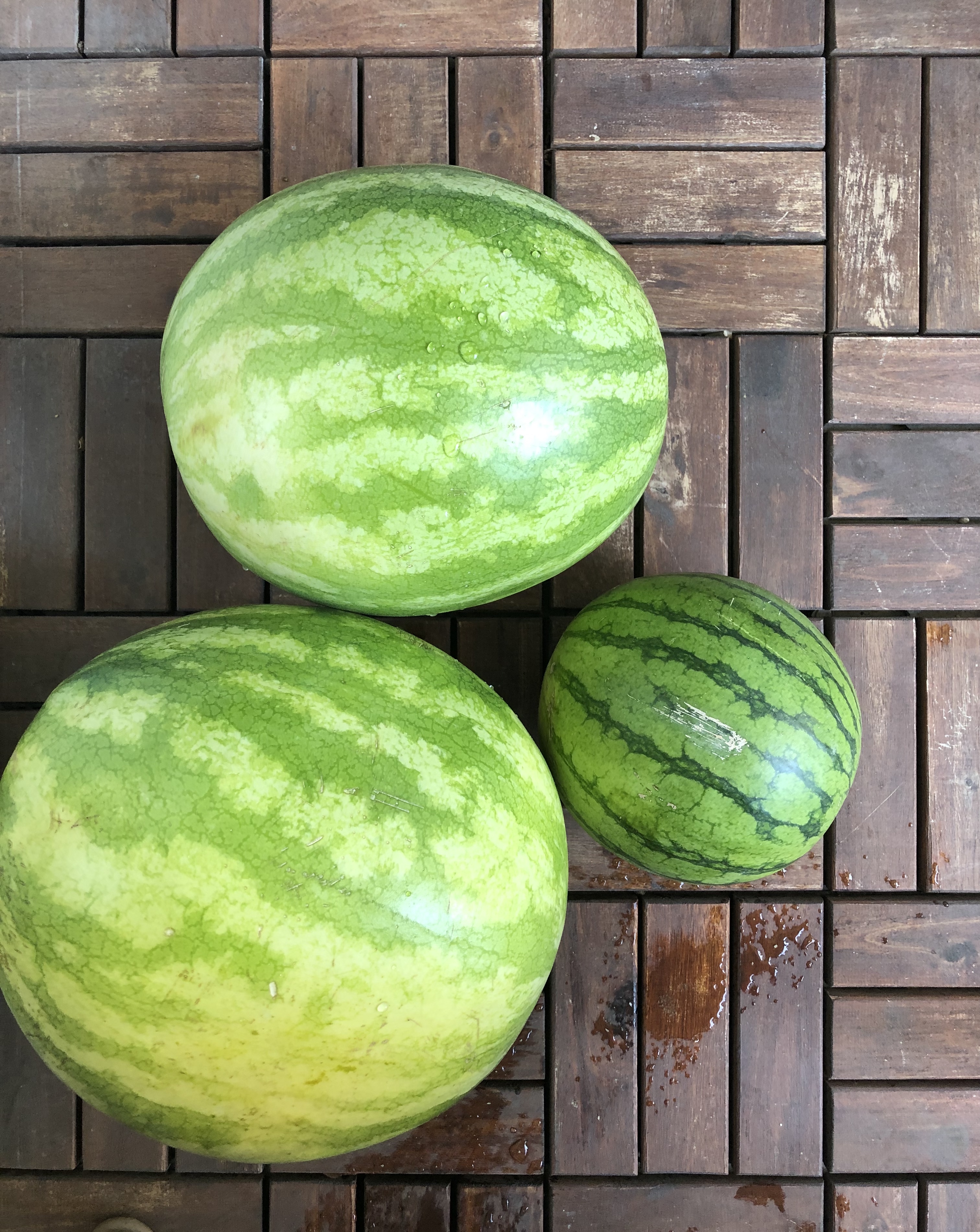 If you can find a large, oblong watermelon, you may be able to carve two of the rounds from it. Then you will only need a smaller one for the final layer. For the demonstration in this blog post, I could only find three watermelons of varying sizes. It’s all good, whatever you source.