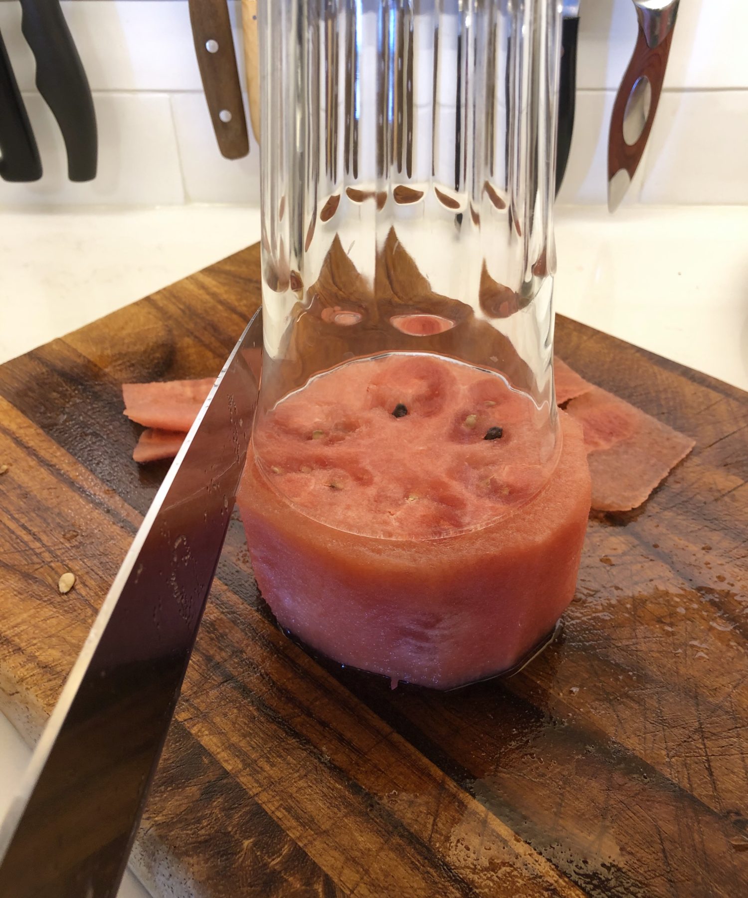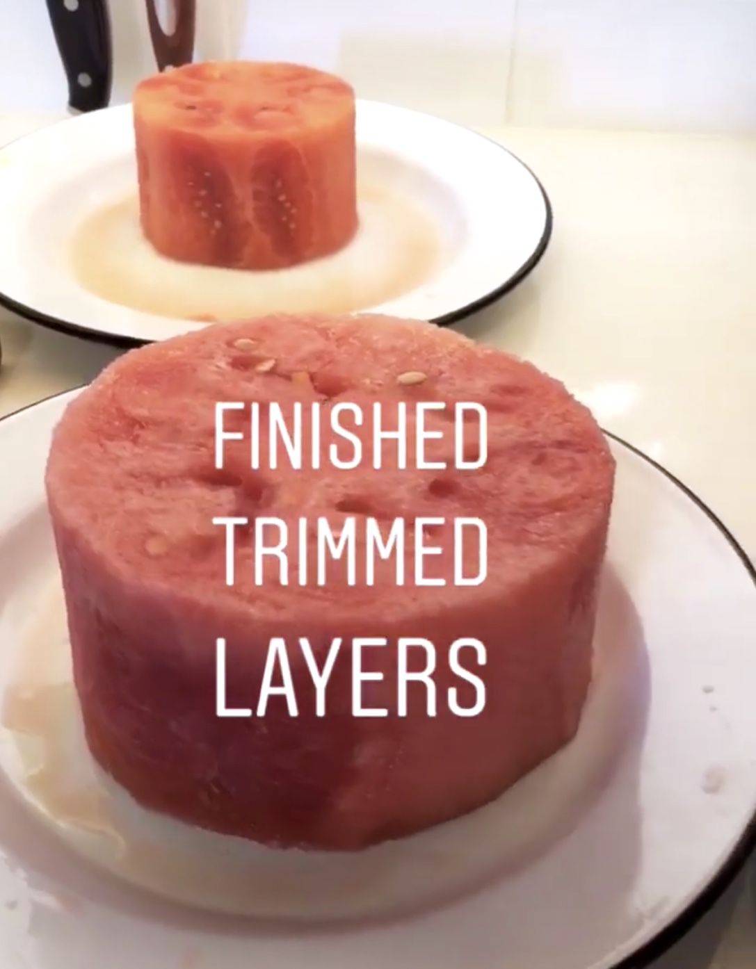 You can see below that the outer rim of one of my glasses fit just inside the smallest round. So I laid it directly on the round, leaving the outer edges exposed for trimming. Take a sharp knife and cut straight down. Give the cutting board a slight twist and cut down again. Keep doing so till you have gone all the way around the watermelon. You will be left with a pretty decent round layer of watermelon. *Ensure that you are cutting straight down and not cutting in on an angle- or else it won’t have straight edges when looking straight on at the finished cake. Repeat with all three rounds.