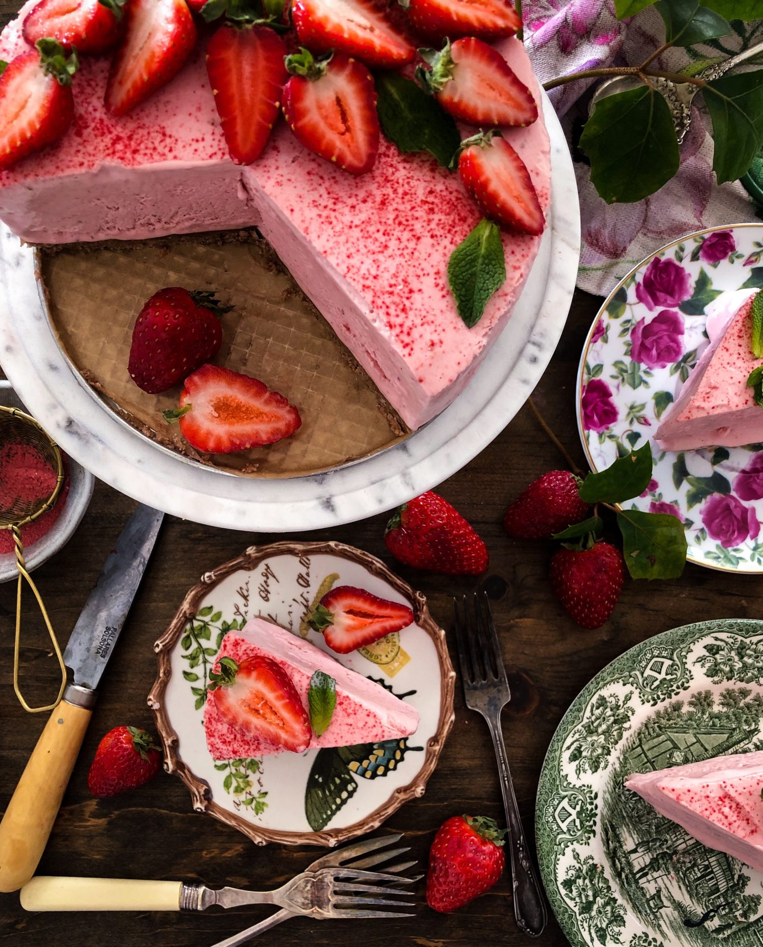 Filed Under: Desserts, Spring Tagged With: almond flour, balsamic vinegar, butter, cheesecake, cream cheese, ground almonds, icing sugar, no-bake, pink pepercorns, stawberry powder, strawberries, whipping cream
