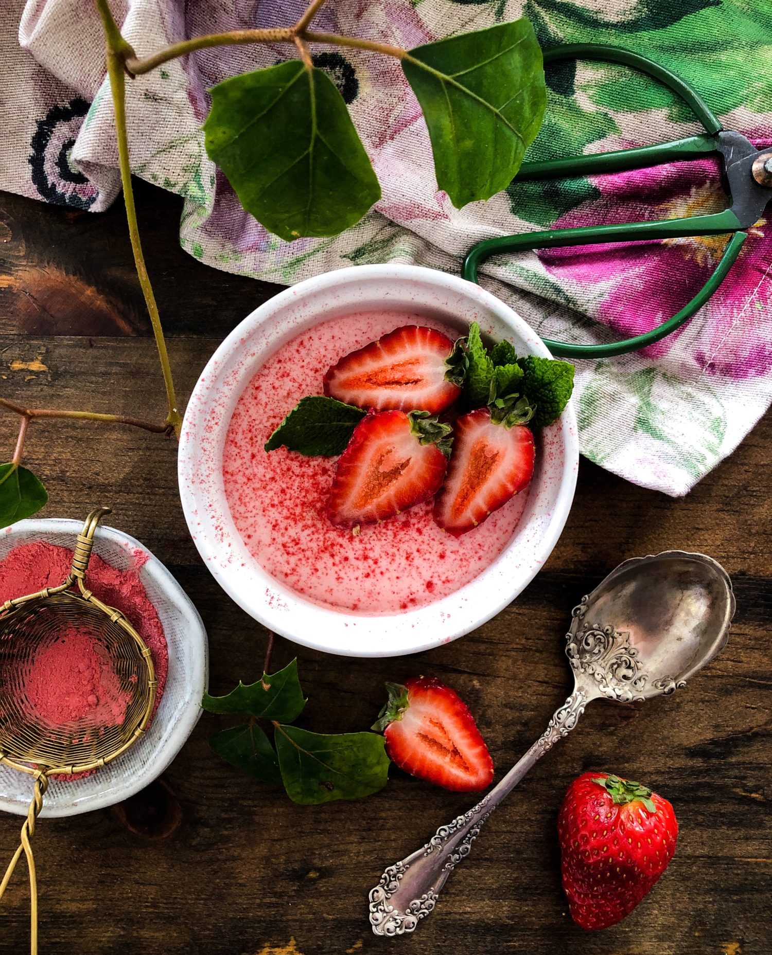 9. Garnish with some sliced strawberries, mint leaves and sprinkling of freeze-dried strawberry powder, if using. Or how about a lovely strawberry coulis, or even a drizzle of chocolate sauce (as long as it isn’t hot!)