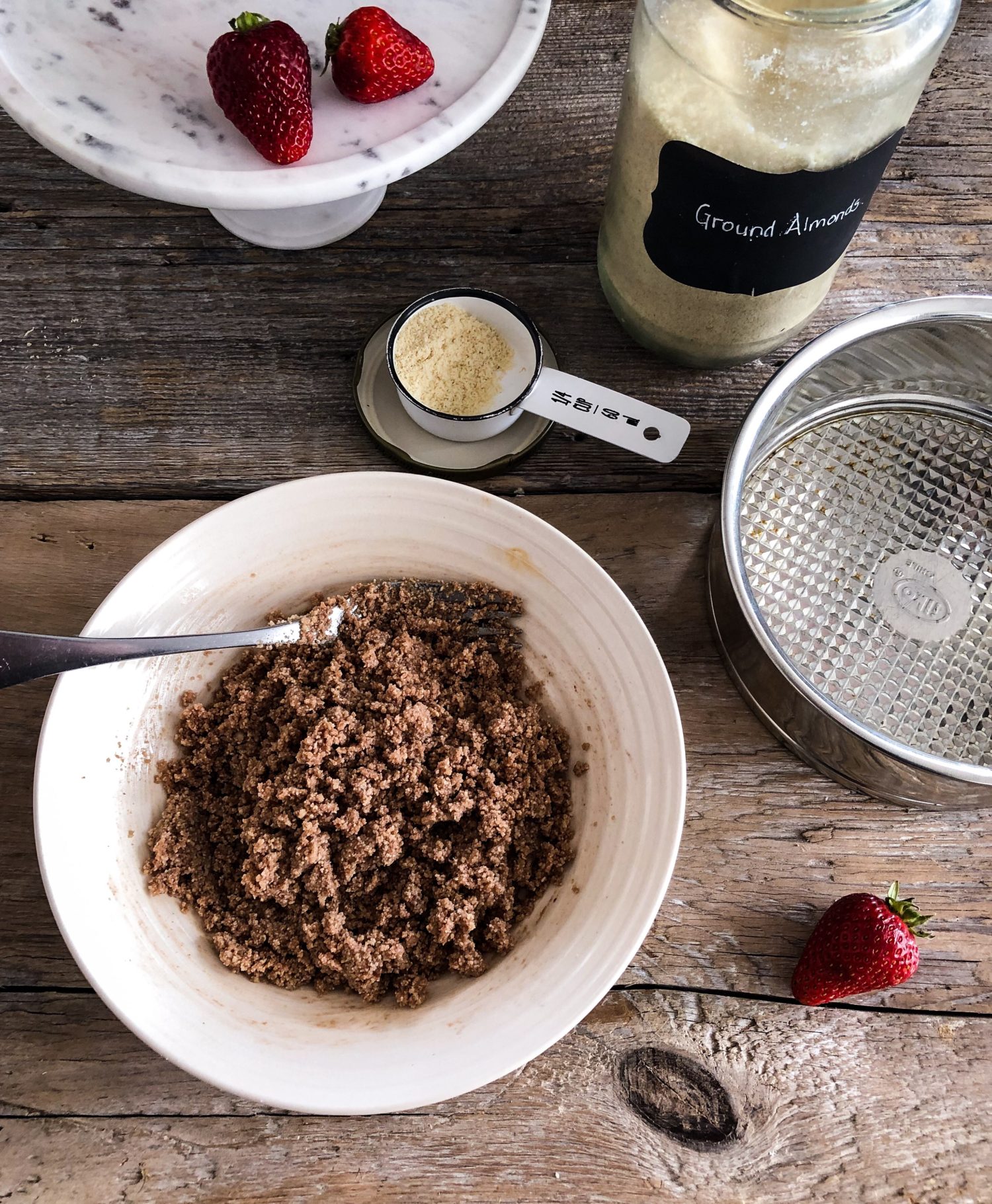 3. Place the ground almonds, sugar and cocoa powder into a medium bowl. Slowly pour the butter over the mixture and blend with a fork till crumbly. If you find it won’t hold when pressed together between two fingers, you could add a little bit of coconut oil to help it out. The humidity of the day (or lack thereof) can affect this.