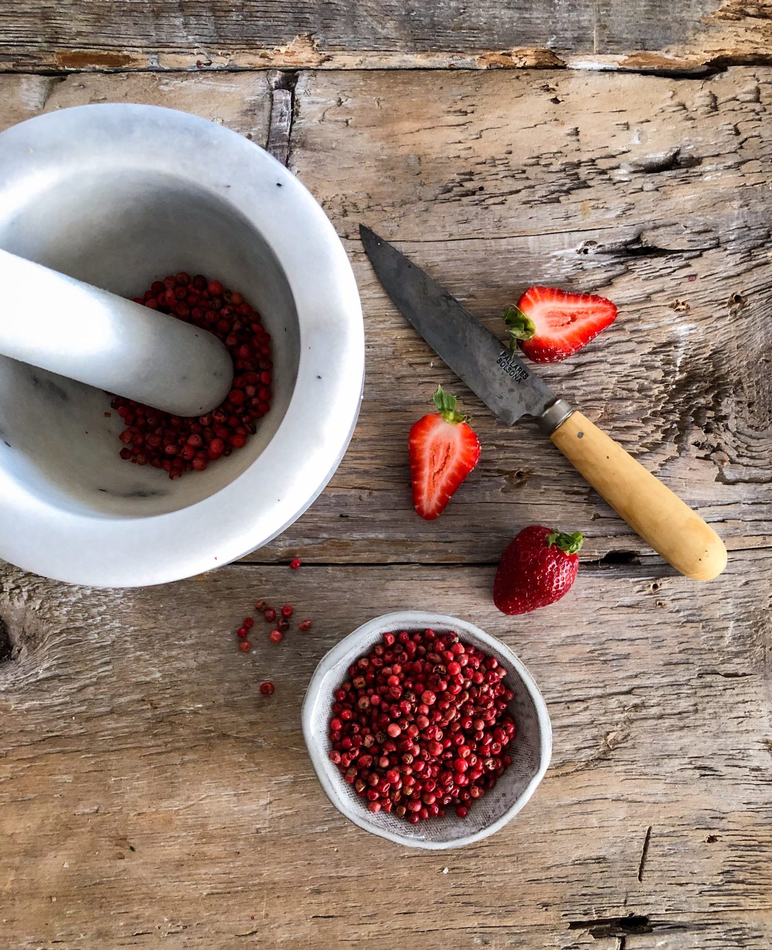 No Bake Balsamic Strawberry and pink peppercorn Cheesecake, pink peppercorns